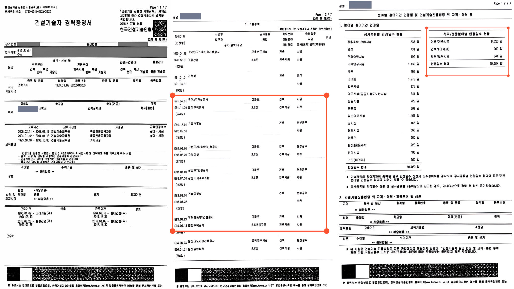 사전점검업체 선정 시 기술자 경력증명서 빨간 부분 꼭 확인하세요.